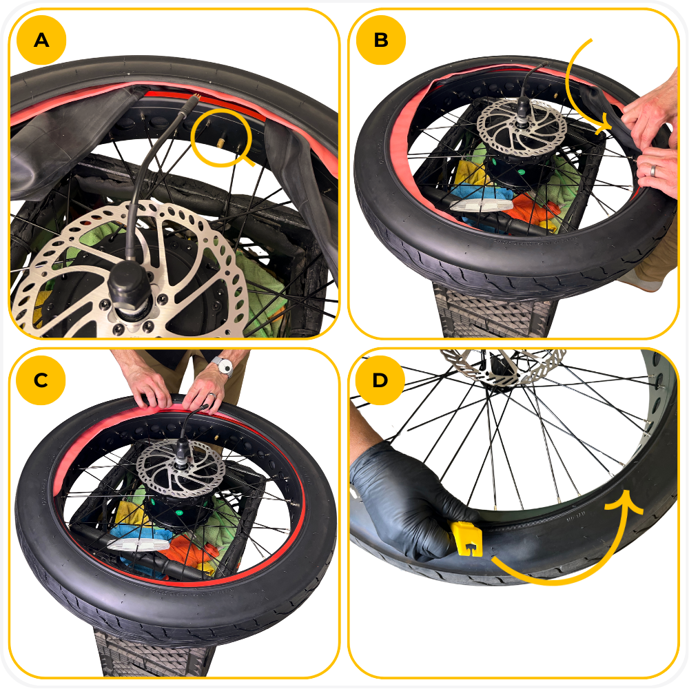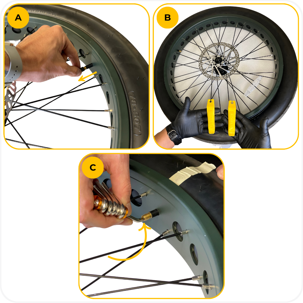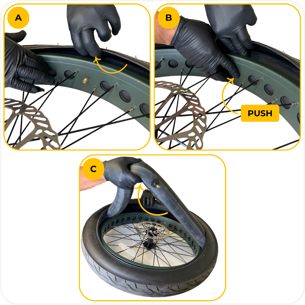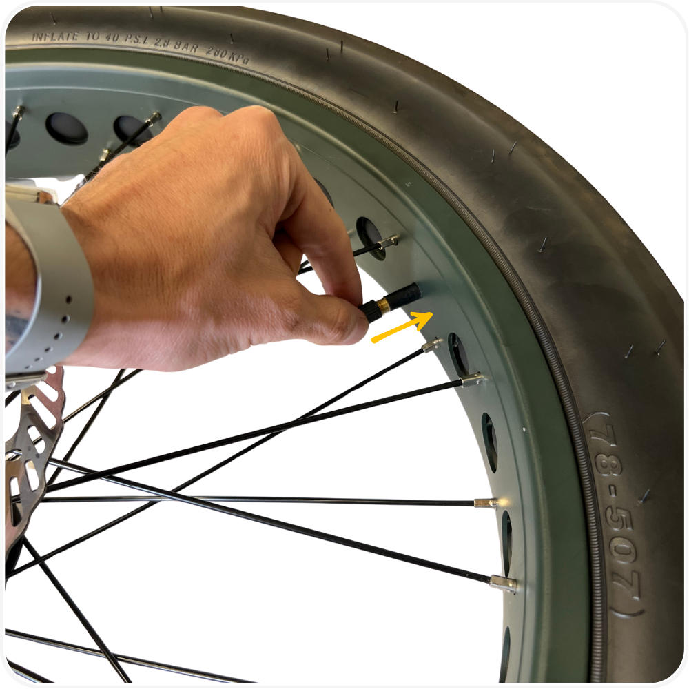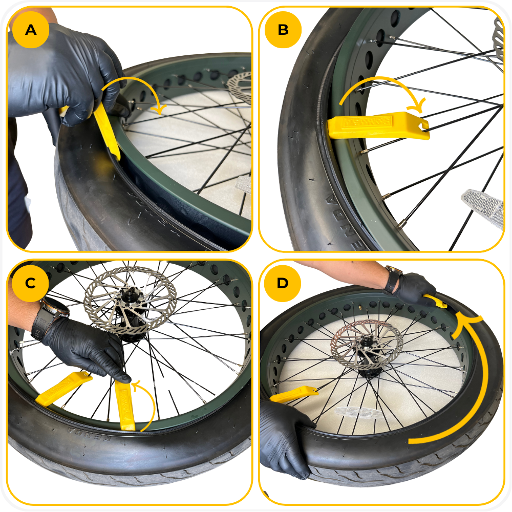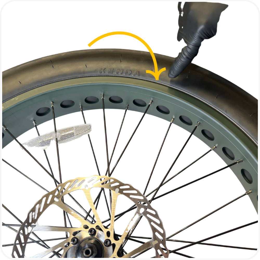 - Hard to install the final section of the tire → Use plastic tire levers and work in small sections. Do not force the bead.