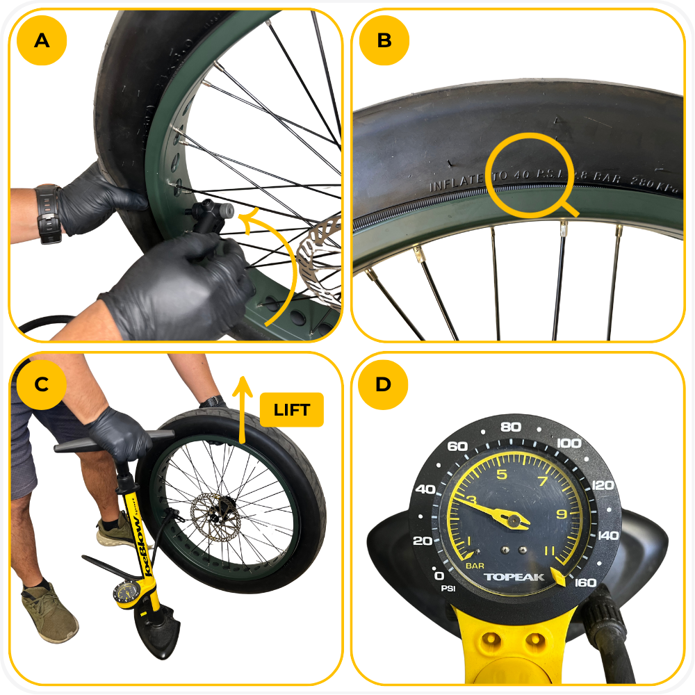 Note: Different MOD BIKE models use different tires, each with its own recommended PSI range. Always check the sidewall of your tire for the correct pressure before inflating.