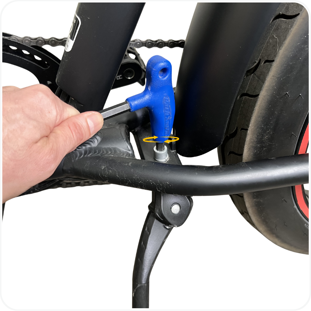 Note: If the bike is leaning too much, go back to Step 4 and adjust the kickstand length. You do not need to remove the kickstand, just loosen the adjustment bolt, extend it slightly, and retighten until the bike sits more upright.